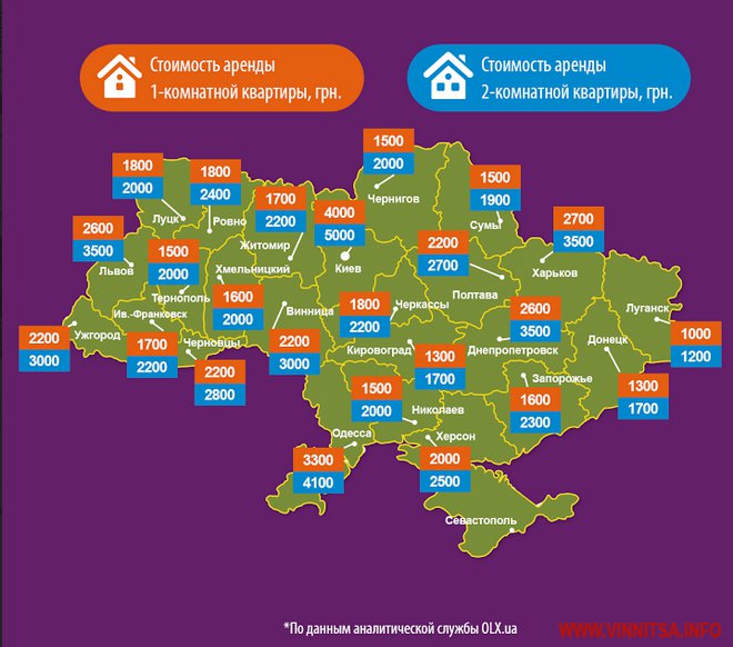 Так у Вінниці середньостатистична однокімнатна квартира обійдеться у 2 200 гривень, за двокімнатну доведеться викласти з гаманця – 3000 гривень. Місто посідає шосту сходинку у рейтингу вартості орендованого житла.