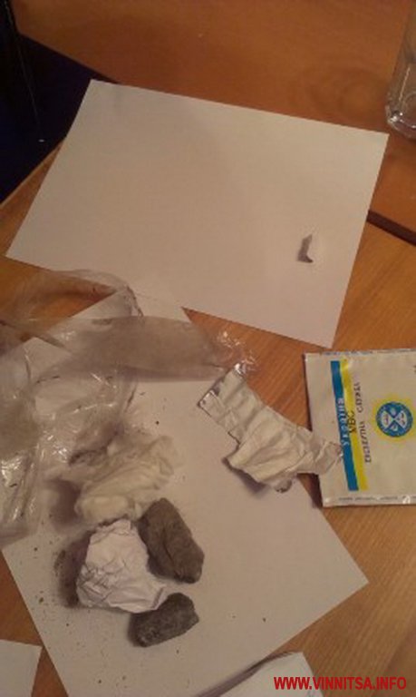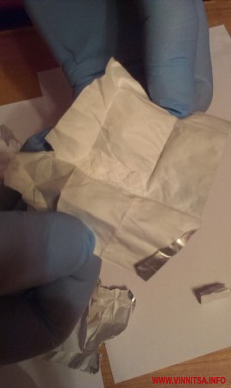 Дану особу було затримано, про що було повідомлено до Вінницького ВП ГУНП України у Вінницькій області. Після прибуття слідчо - оперативної групи громадянину було проведено обшук під час якого, в правій кишені його штанів був вилучений пакунок замотаний в клейку стрічку. В ході догляду даного пакунку було виявлено два маленьких згортки з порошковою кристалічною речовиною білого кольору, схожу на наркотичну.