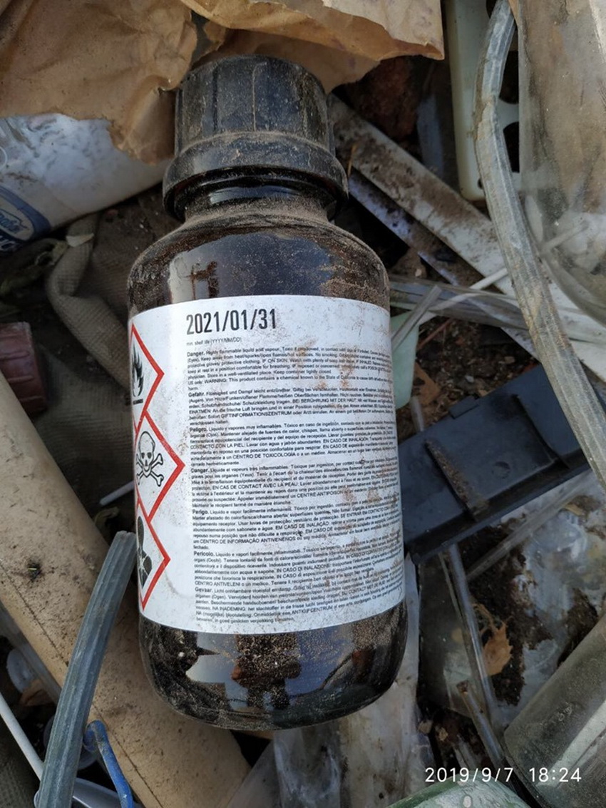 «В ході обстеження сміттєзвалища поблизу села Северинівка було виявлено розміщення відходів, що утворились при експлуатації лабораторії, а саме: тара з-під хімічних реагентів, лабораторний посуд та прилади, в тому числі ртутні термометри.