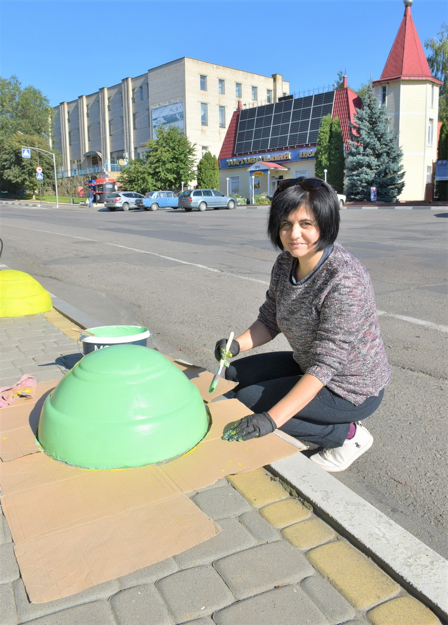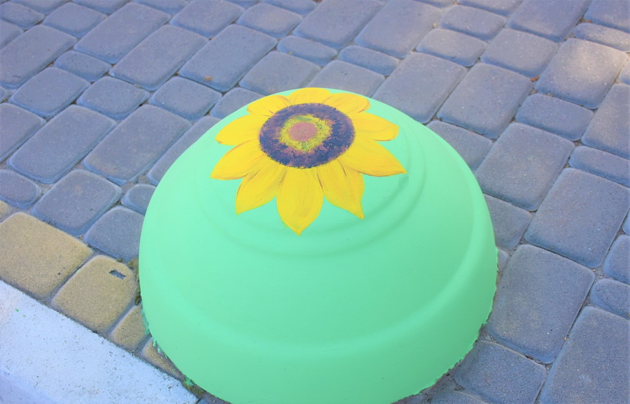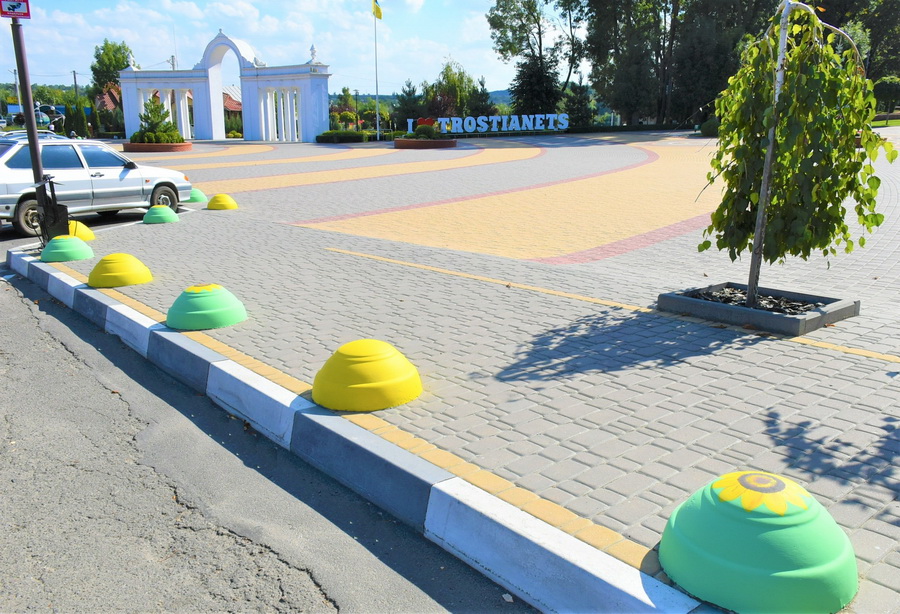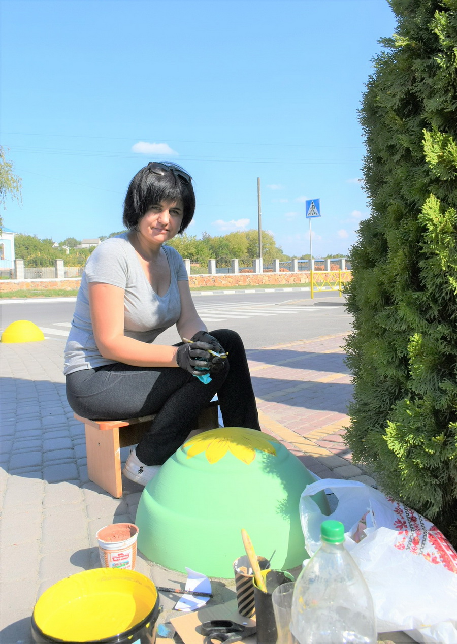 У селищі Тростянець на бетонних паркувальних півсферах «зацвіли» соняшники. Малює їх майстриня, яка переїхала на Вінниччину з Миколаївщини через війну.