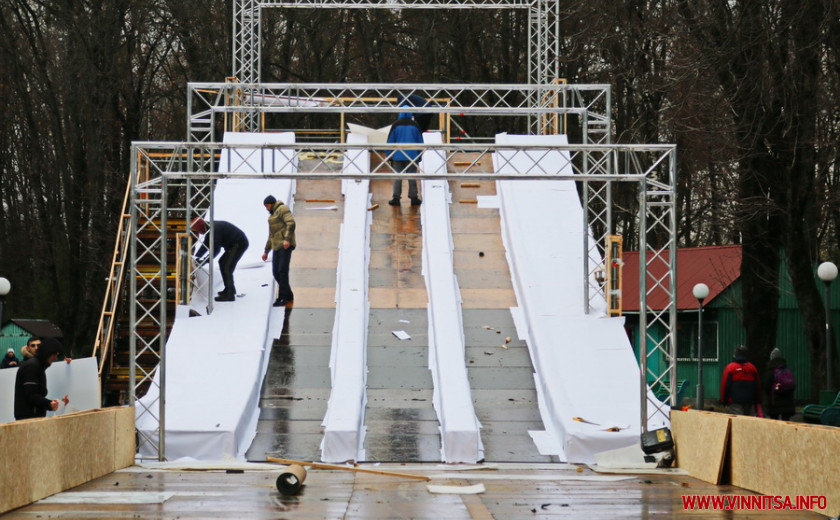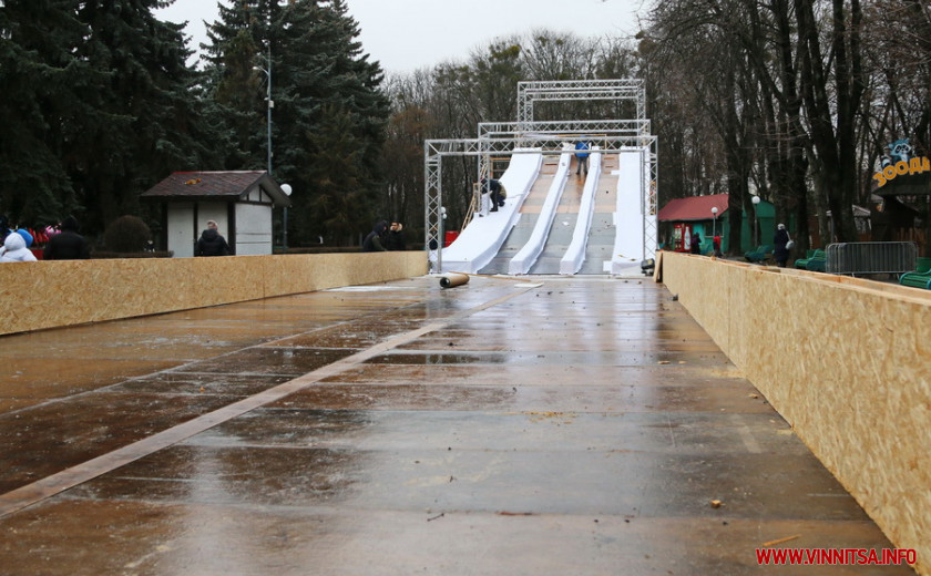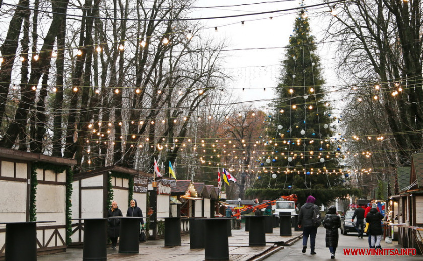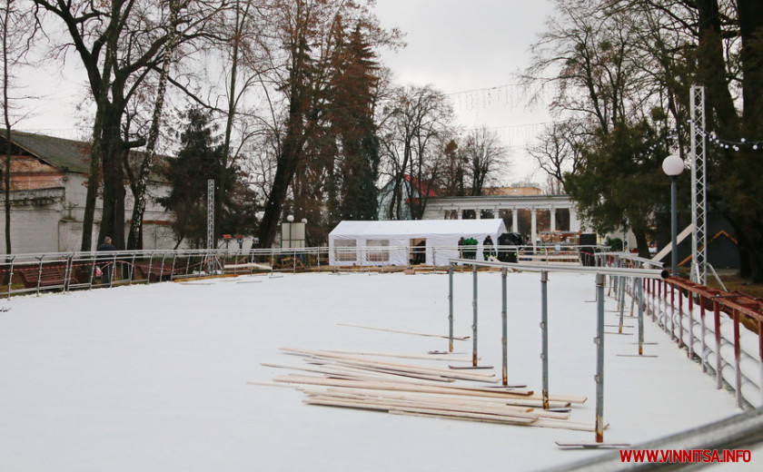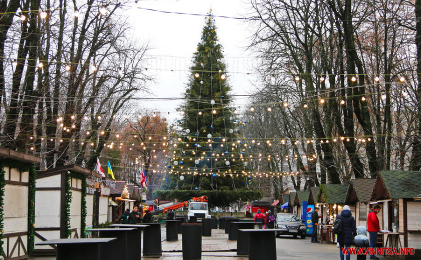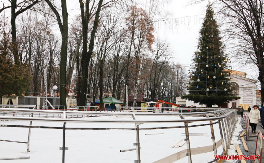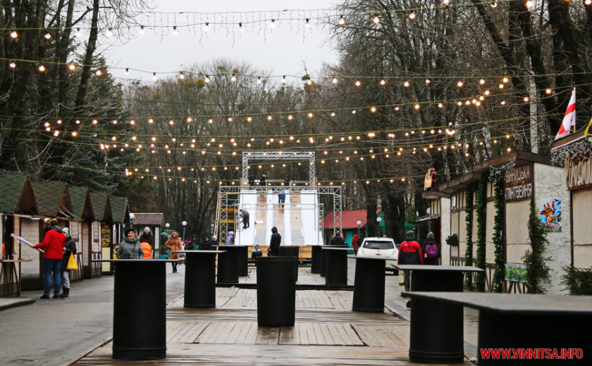 У Вінниці, в Центральному парку, готуються до відкриття «Зимового містечка». Частково уже працює новорічний ярмарок: у ятках продають шкарпетки і рукавиці, смажать шашлик і готують глінтвейн.