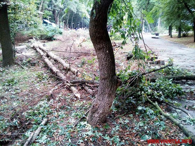 6 і 7 вересня у Центральному парку імені Горького зрізали десяток дерев, які росли поруч КЗ «Райдуга» і біля нової композиції «Міні Вінниця».