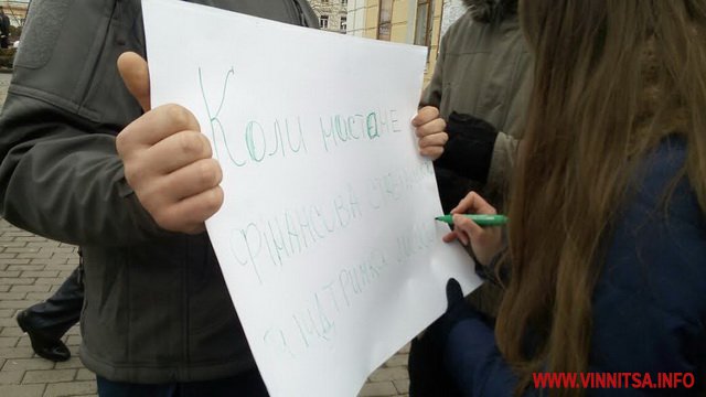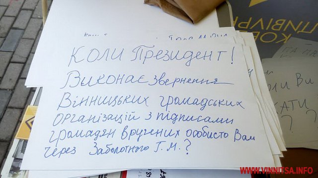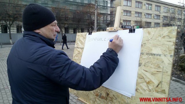 Протягом чотирьох днів на площі Небесної Сотні у Вінниці перехожим пропонували задати питання президенту України Петру Порошенко. Городяни та гості міста писали їх маркерами на ватманах, які завтра розвішають на паркані будинку керманича країни.