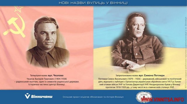 Одну з центральних вулиць Вінниці, названу в честь радянського льотчика Валерія Чкалова пропонують перейменувати на честь Симона Петлюри – головного отамана військ УНР та голови Директорії УНР, який неодноразово бував у Вінниці в 1918 - 1920-х роках.
