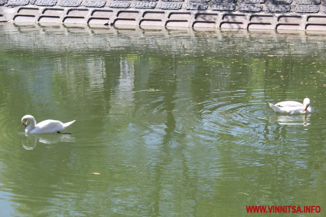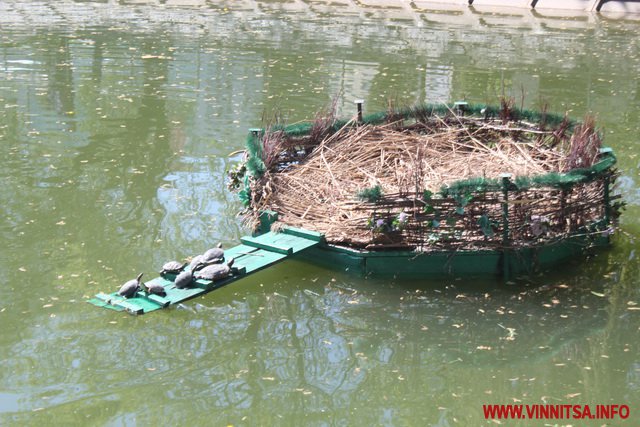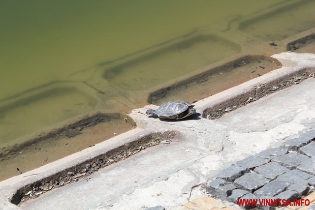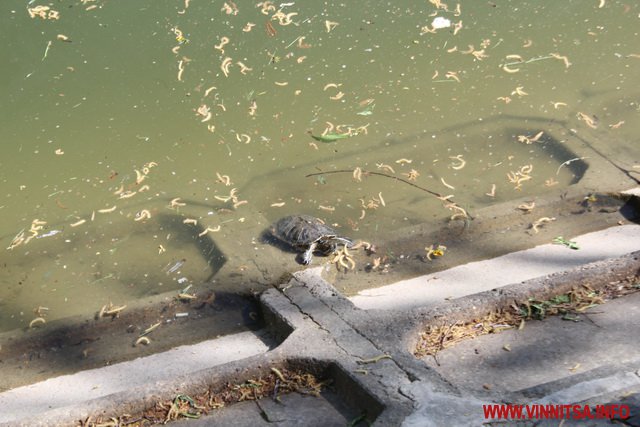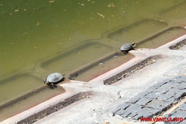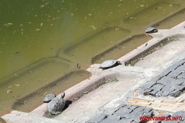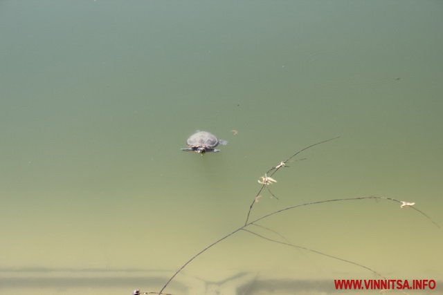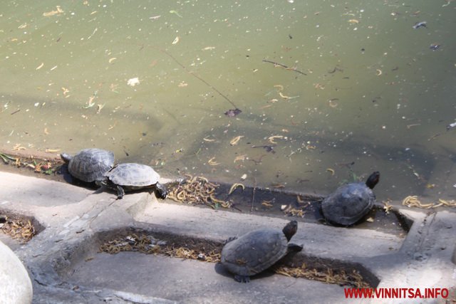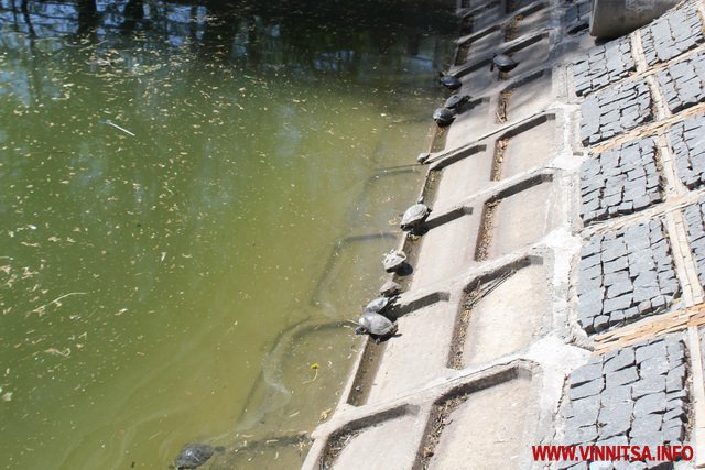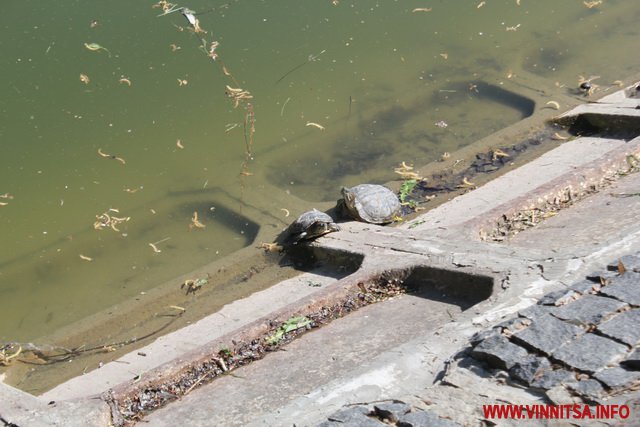 У Вінниці біля Центрального парку на озері поруч з парою лебедів живе біля півсотні черепах.