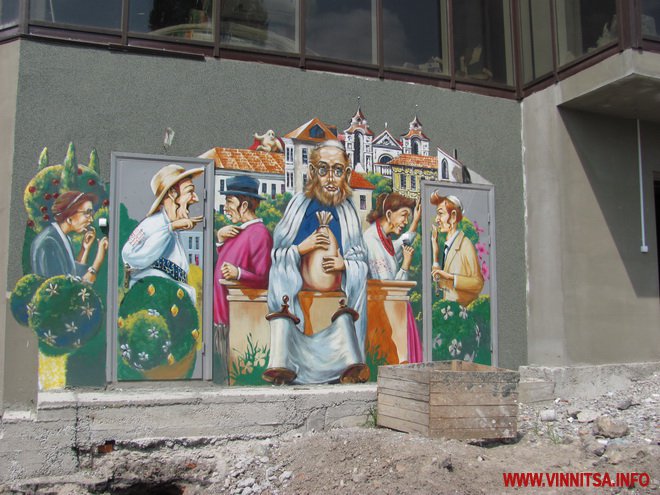 Нещодавно новобудову на перехресті вулиць Володарського та Шолом-Алейхема прикрасив незвичайний малюк. На фасаді приміщення виросло 2-метрове кольорове графіті із зображенням єврейського побуту. Виглядає дуже колоритно.