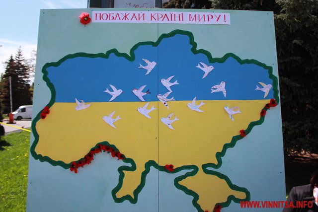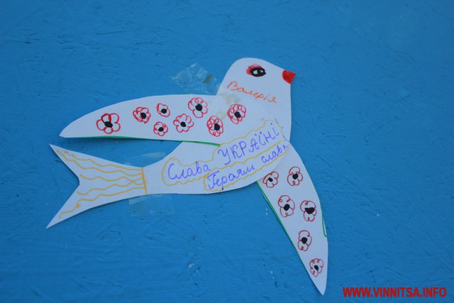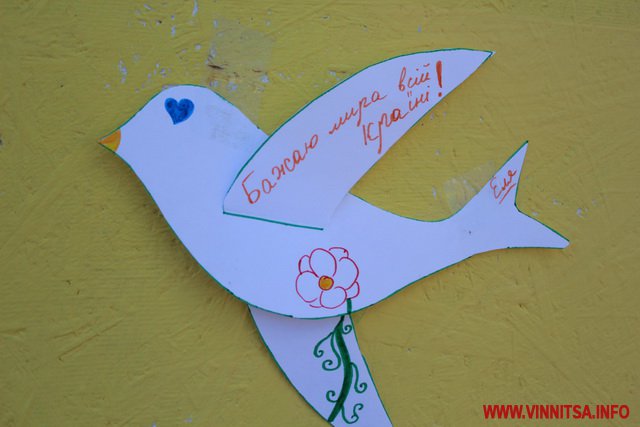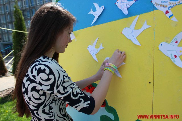 Поблизу розгорнулася величезна картина з Україною. Вінничанам пропонували написати побажання на паперовому голубові миру і прикріпити його до полотна.