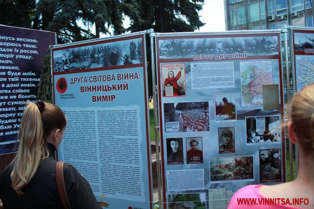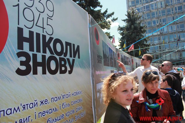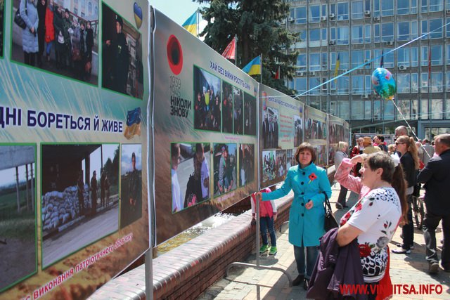 Експозиції «Ніколи знову» розповідали про історію і участь Вінниці і війні, відтворювали у світлинах все, що роблять городяни і влада, аби допомогти бійцям АТО: гуманітарні вантажі, дитячі малюнки, привітальні листівки…