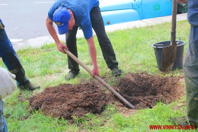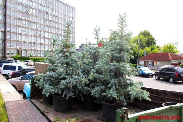 30 травня, вранці, у центрі Вінниці висаджують блакитні ялинки. 13 хвойних дерев ростимуть за приміщенням міської ради зі сторони вулиці Пушкіна.