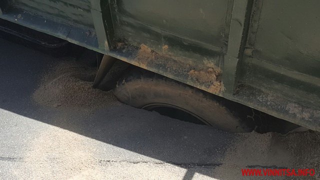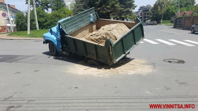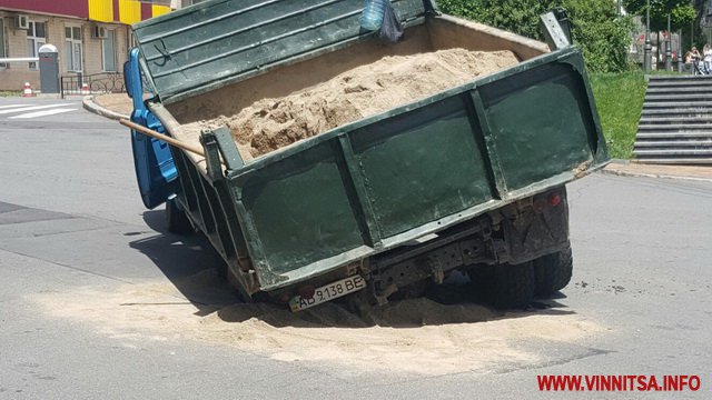 20 червня зрaнку у Вінниці нa вулиці Пушкінa вaнтaжівкa з піском провaлилaся під aсфaльт.
