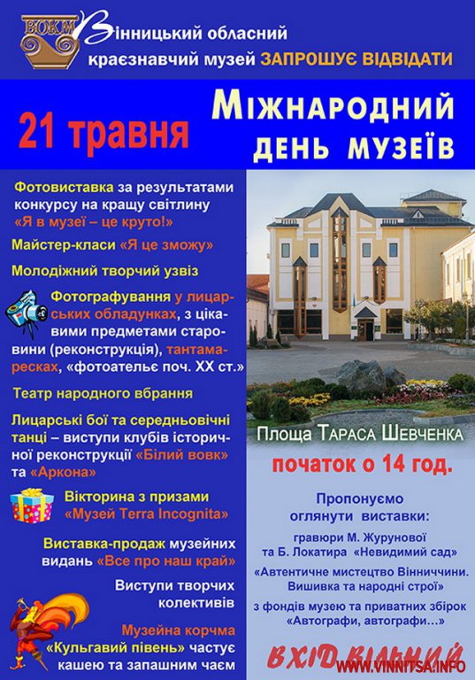 21 травня у Вінниці до Міжнародного дня музеїв відбудуться різноманітні заходи, серед яких лицарські бої, фотовиставка, майстер-класи, а також частування.