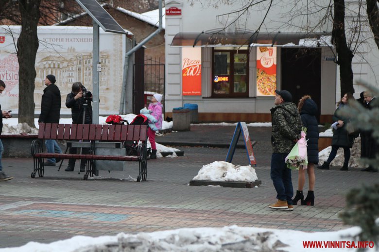 На площі Європейські перебувала учасниця проекту та чоловік з букетом квітів. Згодом – підійшла ще одна пара. Вочевидь, сьогодні у Вінниці знімали фінальну сцену програми.