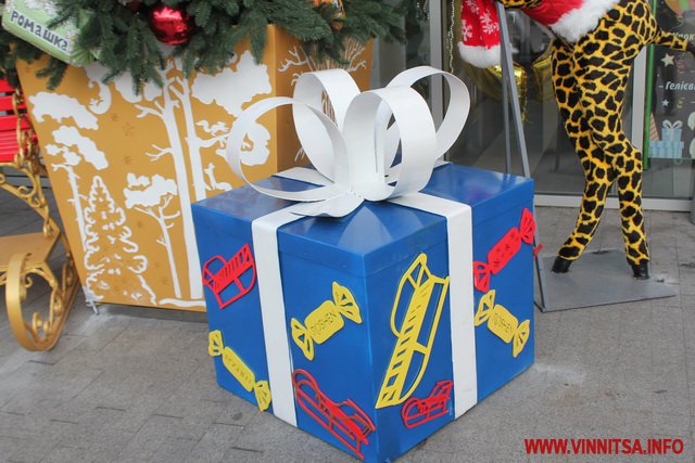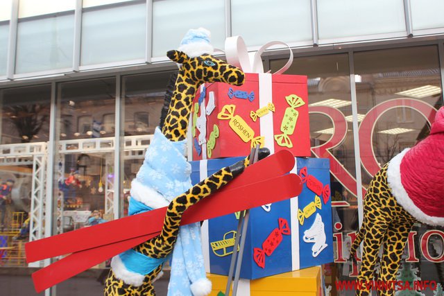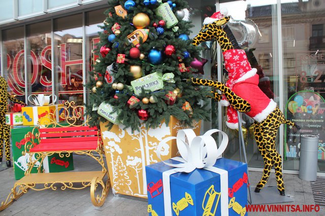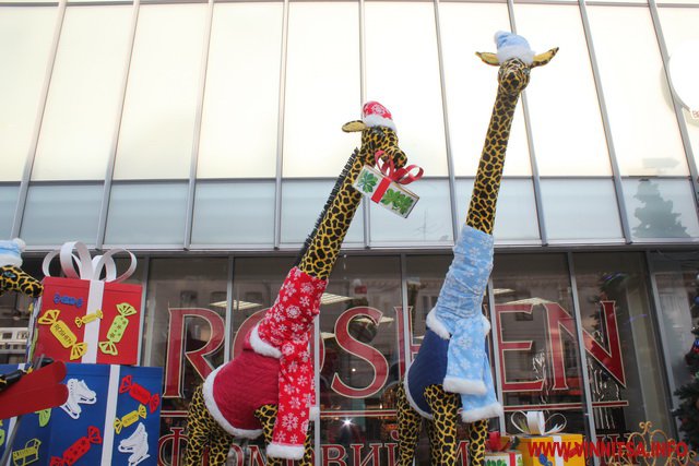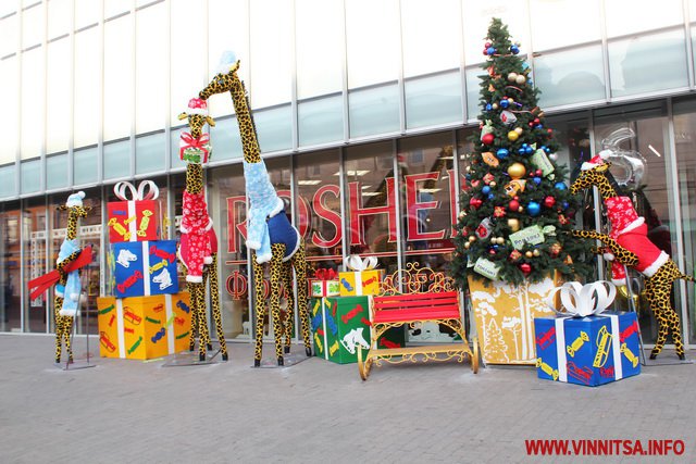 В центрі Вінниці біля магазину Roshen змінили декорації. По вулиці Соборній встановили чотирьох велетенських жирафів, новорічну ялинку та санчата.