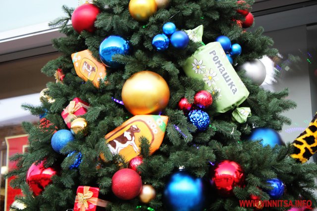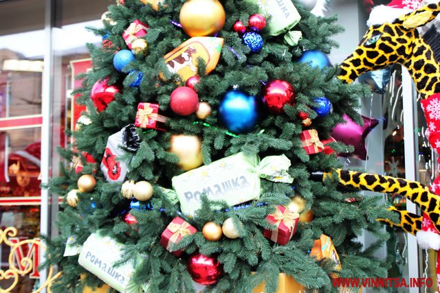 Біля входу в магазин розмістили новорічну ялинку, на ній макети цукерок та іграшки. Поруч санчата, де можна зробити святкові фото та величезні подарункові коробки з новорічною символікою.