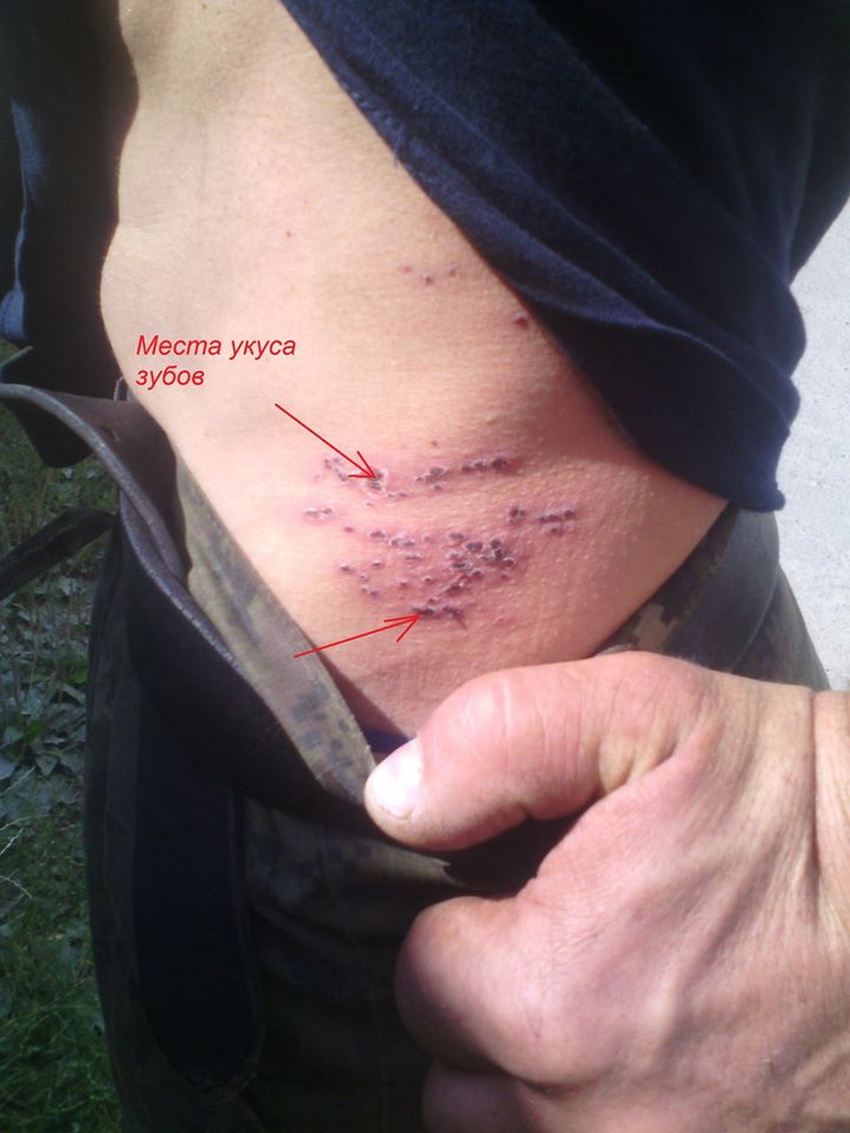 Сліди укусу змії. На фото, де відмічено стрілками, видно місця, від зубів. А червоні плями, то від зміїної отрути, яка навіть пропалила дірки на робочому одязі, як кислота