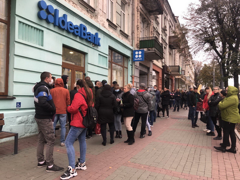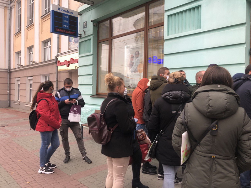 Вранці 20 жовтня на Соборній у Вінниці біля одного з банківських відділень черга біля сотні людей. Як з’ясувалось, це вінничани, яким потрібно заплатити за робочу візу аби працювати за кордоном.