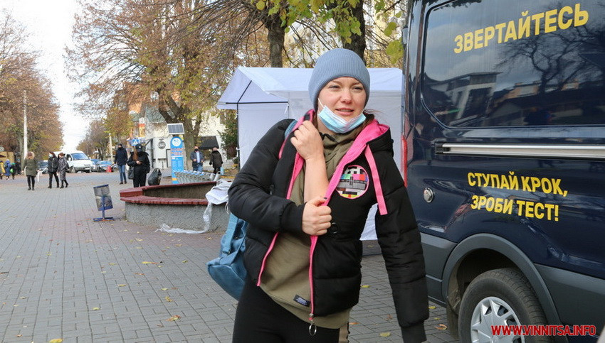Опівдні 24 листопада, біля Вінницької вежі, що по вулиці Миколи Оводова, до десятка людей. Чекають приїзду мобільної лабораторії обласного СНІД-центру. До 1 грудня, коли відзначають Всесвітній день боротьби зі СНІДом, у місті вчергове проводять безкоштовне тестування на ВІЛ та гепатит. Цього року ще й ІФА-тест на COVID-19. Одна з перших, хто прийшов здати аналізи, вінничанка Ольга.