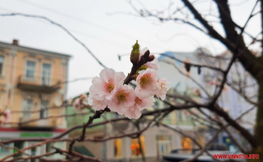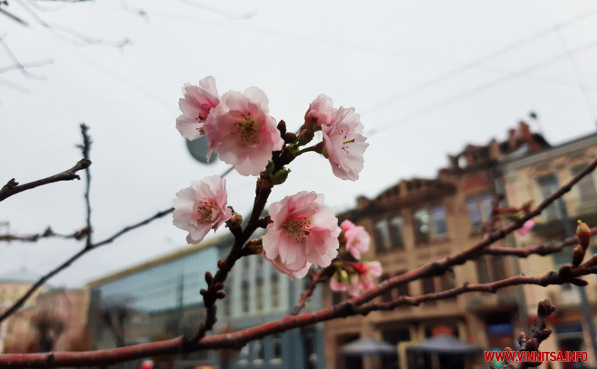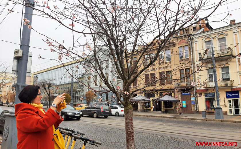 У Вінниці, незважаючи на листопад місяць, зацвіло дерево сакури, що росте навпроти будівлі міської ради. Традиційно сакури цвітуть навесні.