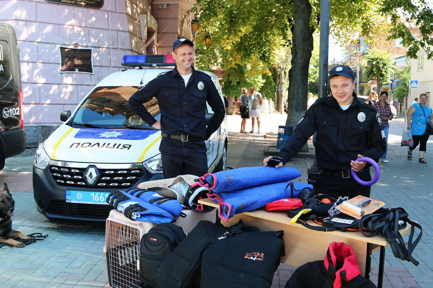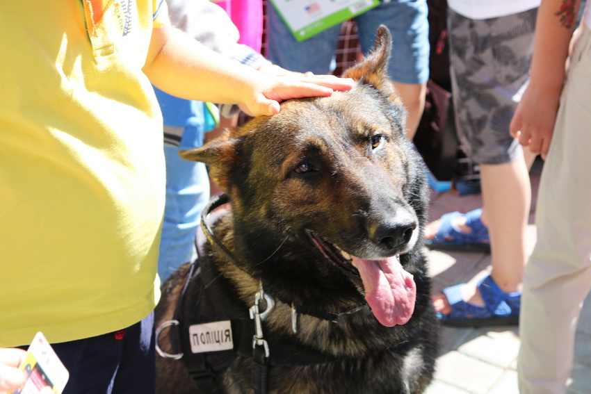 Кінологи прийшли із 8-річним службовим собакою Деном, який одразу став улюбленцем публіки. Ден спеціалізується по розшуку злочинців. Працівники кінологічної служби розповідають, як і за допомогою чого дресирують собак: представлені спецкостюми, іграшки для собак, намордники, ошийники. На згадку усі фотографуються із Деном, який вміло виконує команди.