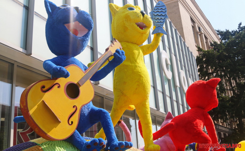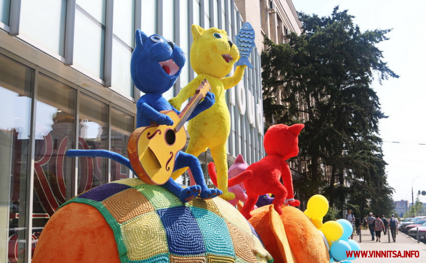 Це чотири велетенських коти, що сидять на слонові. Один тримає в руках гітару, інший – рибу.