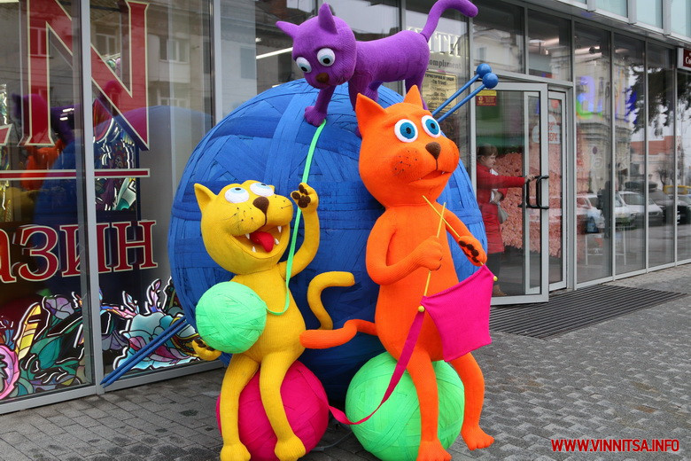 Нещодавно у центрі Вінниці з’явилася нова локація для яскравих фото. Біля магазину Roshen, що на вулиці Соборній, встановили нові мультяшні фігурки. Це п’ять велетенських котів, що сидять на клубках, один з них – щось в’яже.