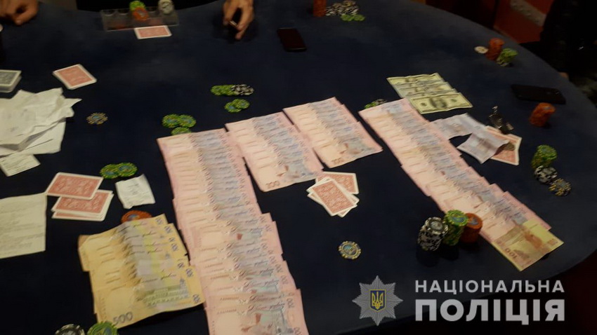 Під час проведення санкціонованого обшуку в приміщенні правоохоронці вилучили речові докази - колоди карт, набори з фішками, грошові кошти в гривнях та доларах США, столи, обладнані для гри в покер, записники з нотатками про борги осіб.