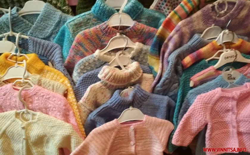 Тетяна Олександрівна на ярмарку продає сплетені власноруч теплі дитячі светри і шапочки з девізом «В’язалочку купи – ЗСУ допоможи».