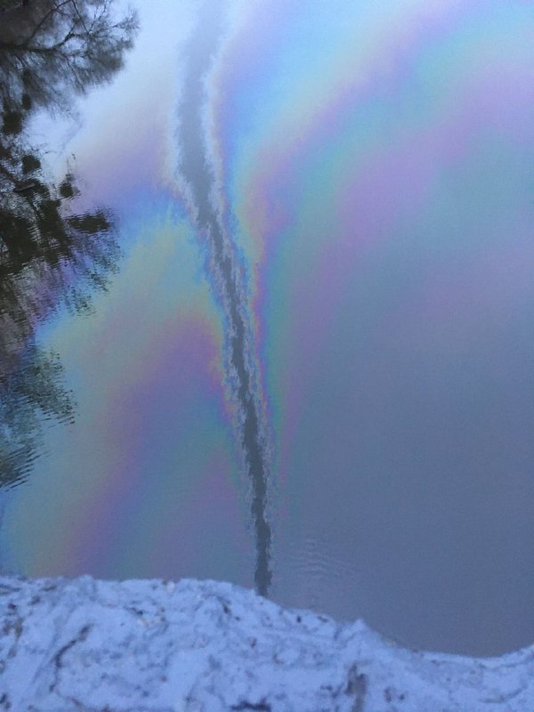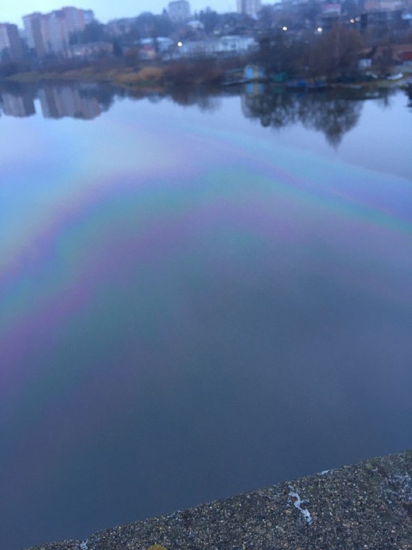 Вранці, жителі міста спостерігали плями із забарвленням, що нагадує кольори веселки. По обіді вони набули біло-сірого кольору.
