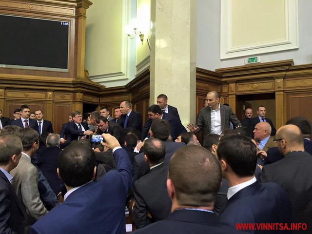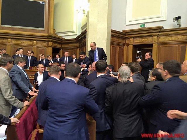 Один з нардепів від БПП Степан Барна підійшов до Яценюка з квітами, перев’язаними чорною стрічкою і хотів їх вручити прем’єру. Після цього зчинилась бійка.