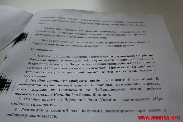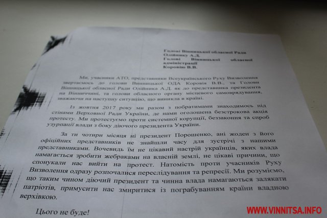 Вимоги активісти реєстрували у Вінницькій ОДА та РДА. Просять розглянути їх на найближчій обласній сесії. Їп перелік такий: