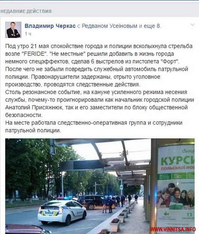 21 травня під ранок на вулиці Пирогова біля «Феріде» стріляли. Автівку поліцейський, які під’їхали до правопорушників пошкодили.