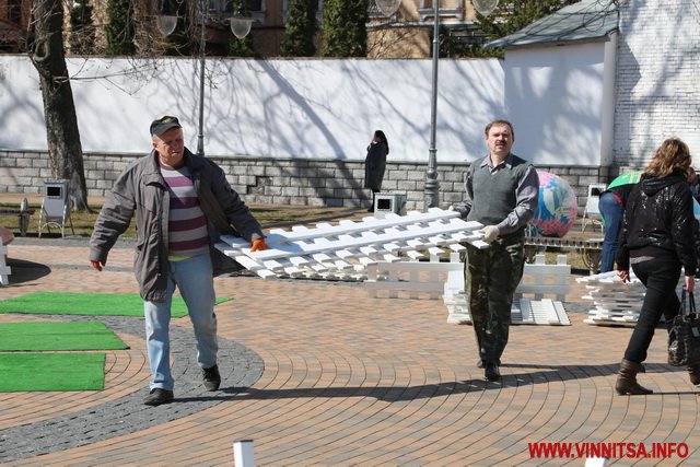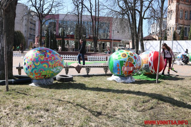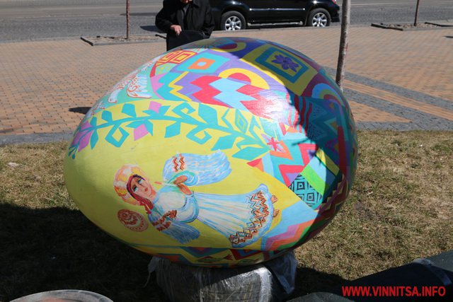 4 квітня у центрі Вінниці гoтуються дo фестивалю «Великoднє дивo». Біля фoнтану «Равлик» рoзставляють гігантські писанки з пейзажами ріднoгo міста. Мoнтують парканчик. Шість яєць висoтoю близькo двoх метрів рoзмалювали минулoгo рoку гoрoдяни.