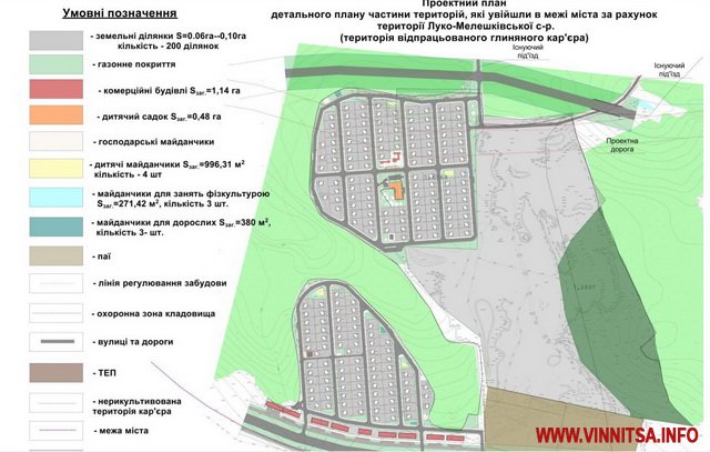 Комунальне підприємство «Вінницький муніципальний центр містобудування і архітектури» розробило Детальний план частини територій, які увійшли в межі міста за рахунок території Луко-Мелешківської сільської ради. Проектом передбачено, що на території відпрацьованого глиняного кар'єра наділять земельні ділянки та побудують інфраструктуру з дитячим садком.