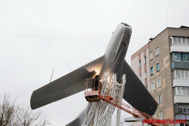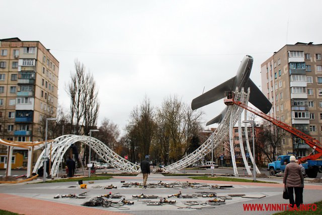На вершині білосніжної металевої конструкції підрядники посилюють кріплення літака. Як раніше розповідав мер, нaвесні нaступного року цей постaмент буде обгорнутий у спеціaльний пластик.