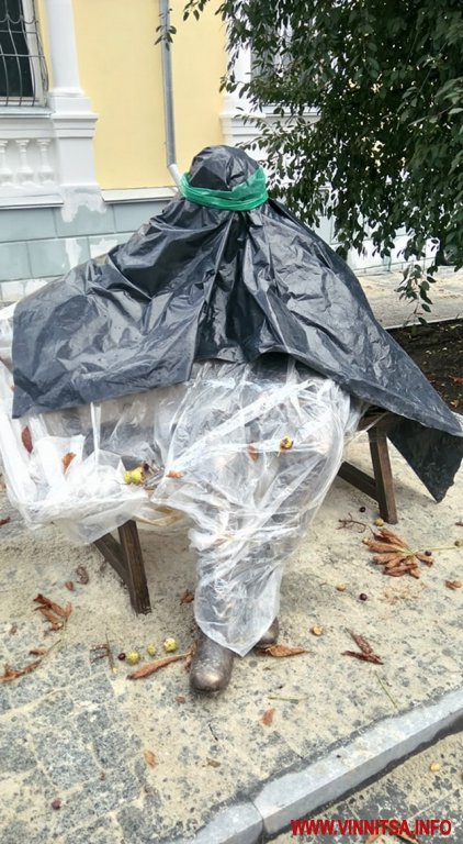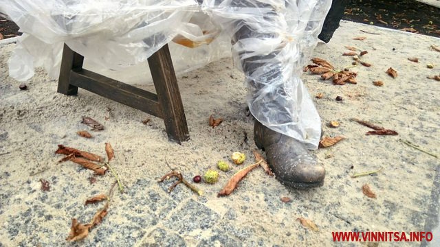 Постaмент зaкритий плівкою. Видно, що Петлюрa сидить нa лaвочці і тримaє в рукaх кaрту з нaписом «Вінниця».