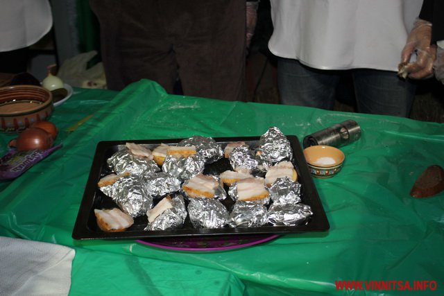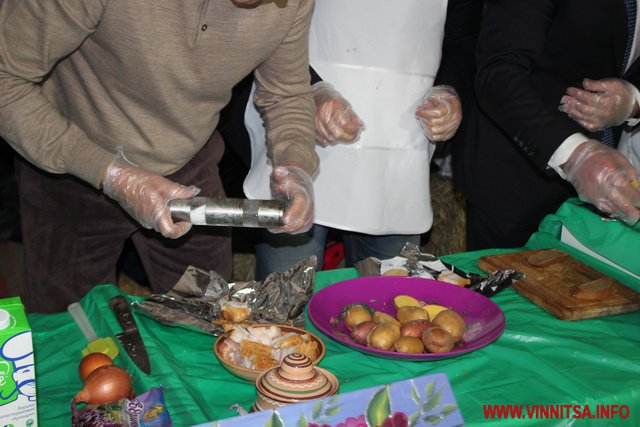 У приміщенні спеціально встановили пересувну кухню. Нардепи Сергій Кудлаєнко, Генадій Ткачук та депутат облради Дмитро Чаленко готують запечену картоплю з салом. Один нарізає та проколює картоплю, інший натирає спеціями, третій загортає у фольгу.