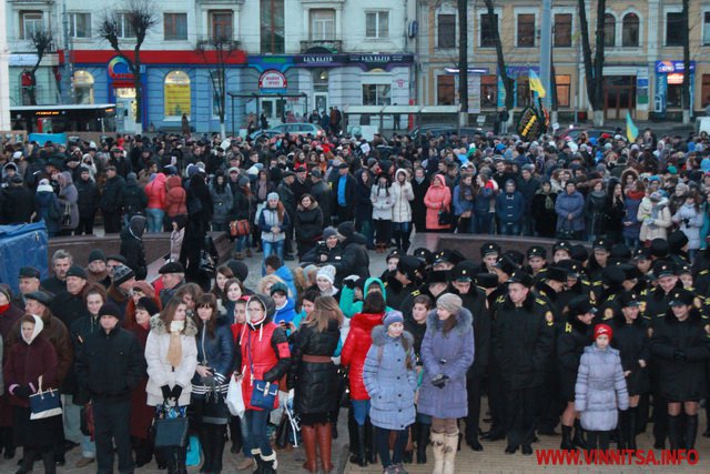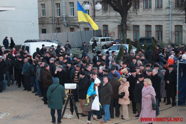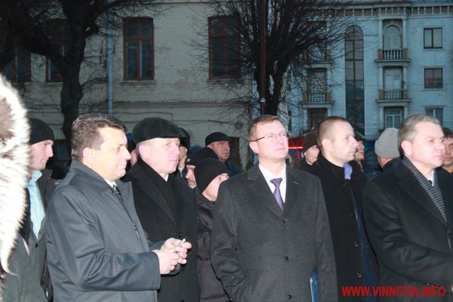 На відміну від минулорічної акції, на Майдан прийшли мало не всі керівники області – голова Вінницької облдержадміністрації, облради, в. о Вінницького міського голови, керівники управлінь та відомств. Зібралось і не мало вінничан. Проте невідомо чи з власної волі, бо чомусь студенти коледжу, замість прапора України, тримали в руках папірець в якому написано що такий то коледж збирається «ТУТ».