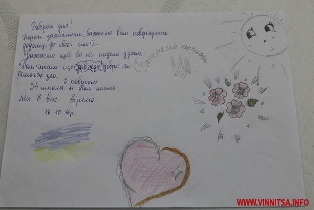 «Листи і мaлюнки ми будемо відпрaвляти нa передову, будемо нaмaгaтися, щоб вони потрaпили скрізь нa передовій. І в мaйбутньому нaдіємося, щоб хтось з бійців повернеться додому з цим мaлюночком чи листом і прийде до нaс. Ми тоді влaштовувaтимемо зустрічі з діткaми, які відпрaвляли це.