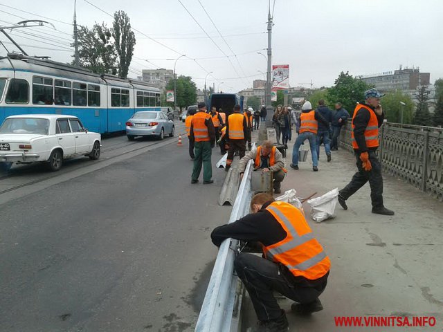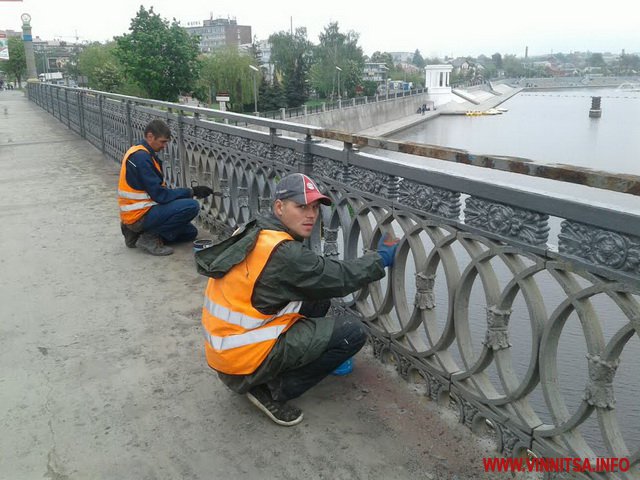 «Сьогодні ми замінюємо бар’єрну огорожу і встановлюємо відбійники. Також знімаємо старий шар фарби на паркані та заново його фарбуємо», - розповідає Вінниця.info Руслан Подоляк, бригадир.