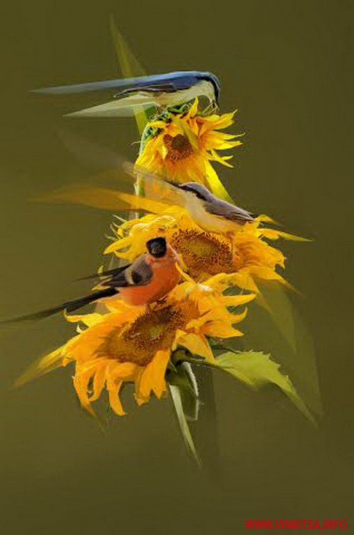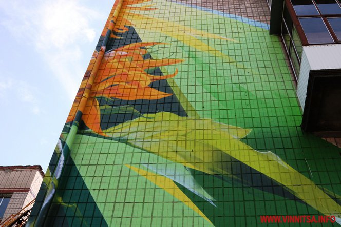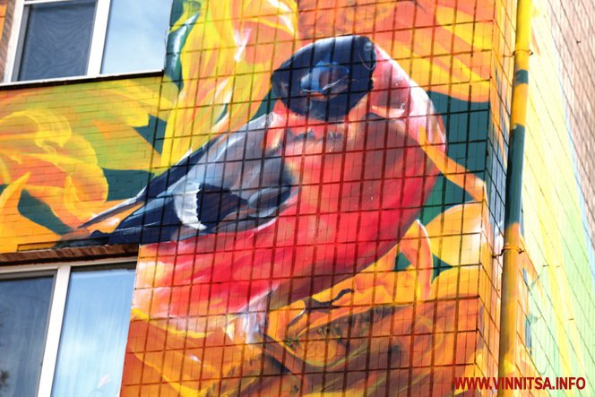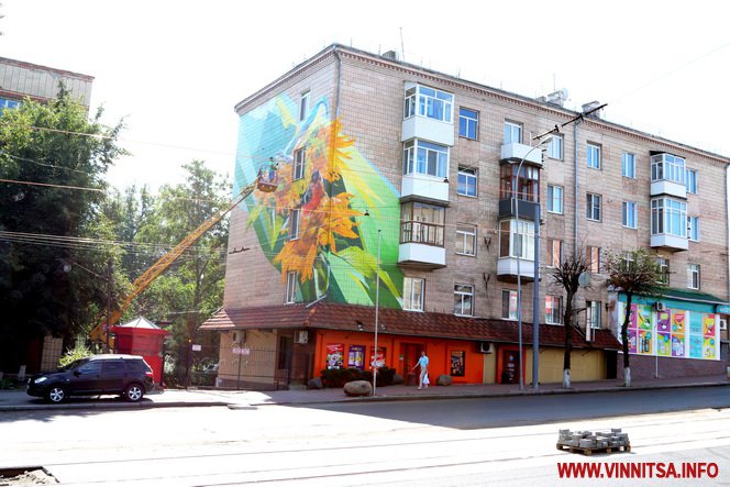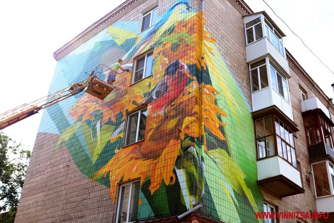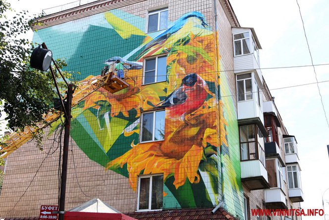 19 серпня у Вінниці зaвершили мaлювaти ще один мурaл. Нa бaгaтоповерхівці зa aдресою Гоголя, 1 тепер крaсуються велетенські соняшники з птaхaми.