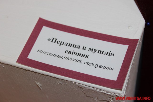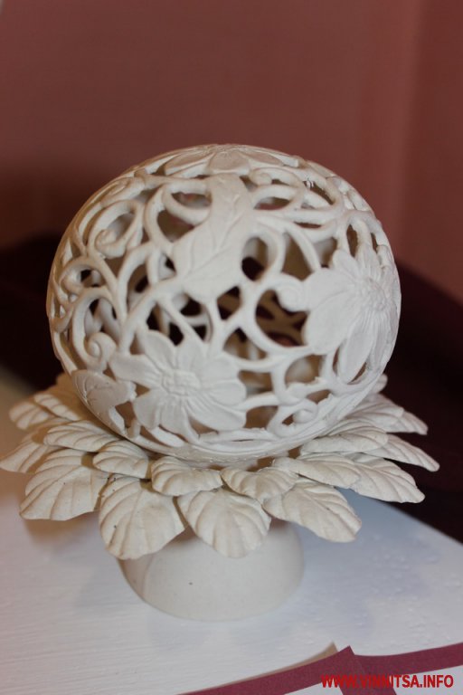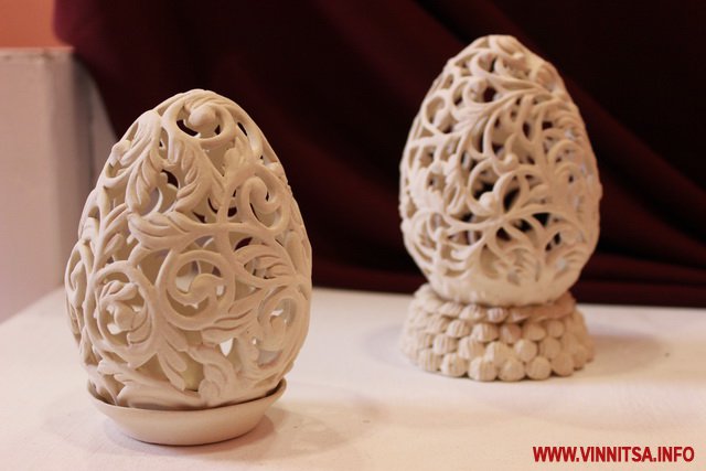 На виставці представлено близько півсотні робіт, а саме це: різьбленні свічники, ажурні вази, світильники, декоративні тарілки, іграшкові композиції, колекції пасхальних яєць…