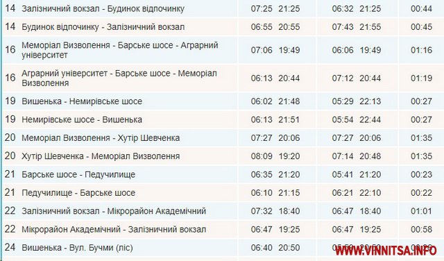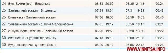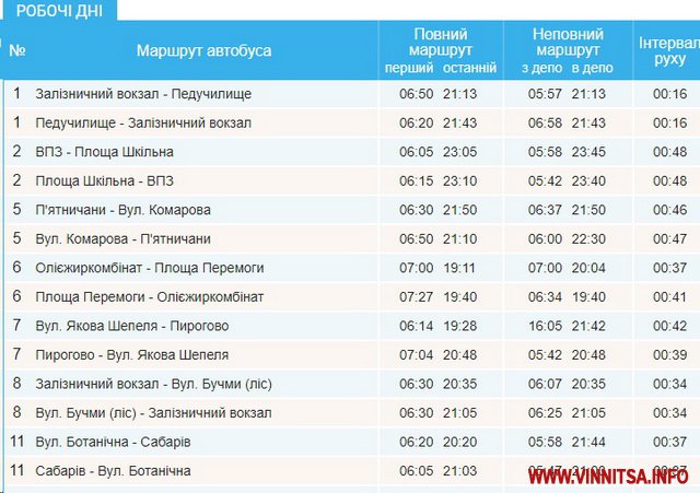 Розклад руху автобусних маршрутів м. Вінниці у робочі дні. Оновлений 28 листопада 2017 р.