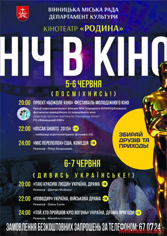Дві ночі – з 5 на 6 та з 6 на 7 червня у вінницькому кінотеатрі «Родина» проходитиме проект «Ніч в кіно». Бажаючі зможуть безкоштовно переглянути цікаві українські фільми, оскарівські короткометражки та краще від ВІННИЦіАнського фестивалю.
