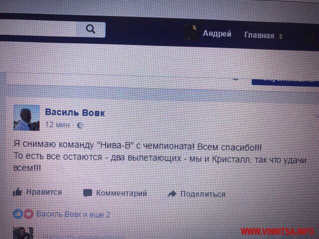 «Я знімаю команду «Нива-В» з чемпіонату! Дякую всім!!! Тобто, всі залишаються - два вилітають - ми і «Кристал», так що удачі всім!!!», - пише Василь Вовк на своїй сторінці у Facebook.