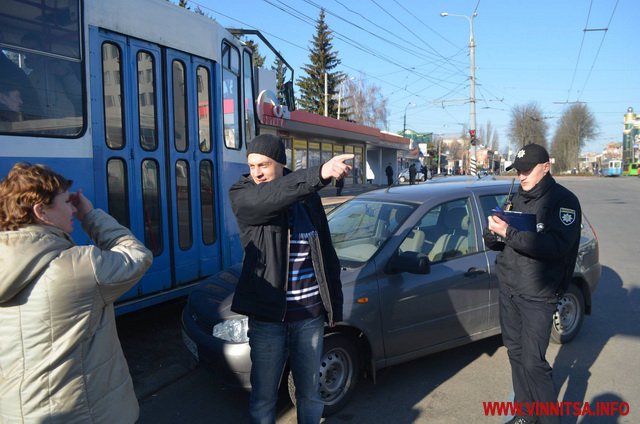 У Вінниці біля лікарні ім.. М. Пирогова пасажири переносили легковик «Лада Калина», який запаркувався близько до трамвайної колії, чим заблокував рух електротранспорту.