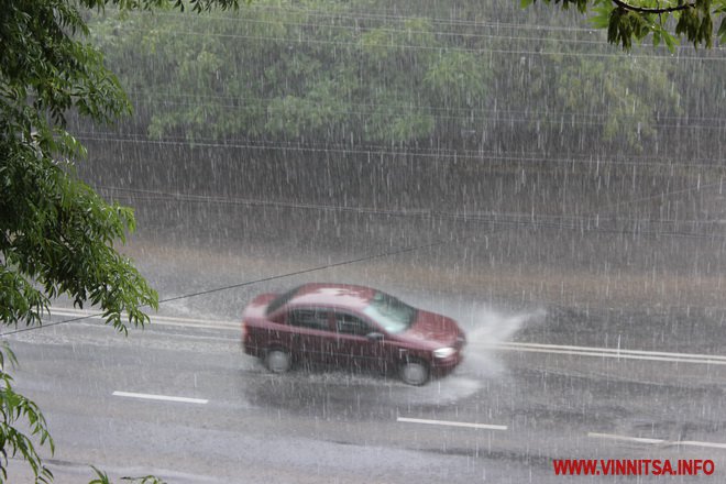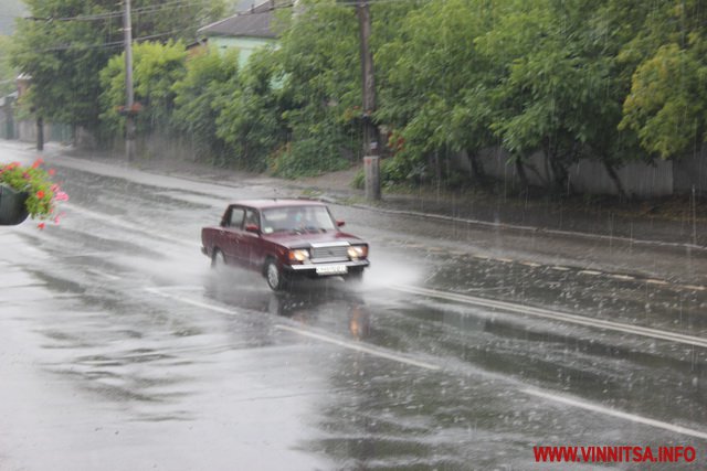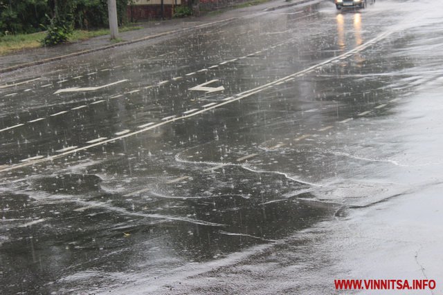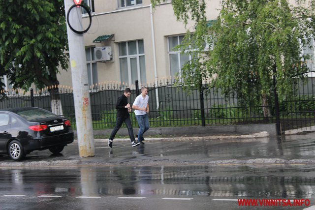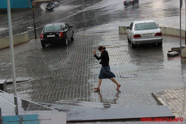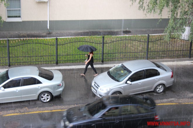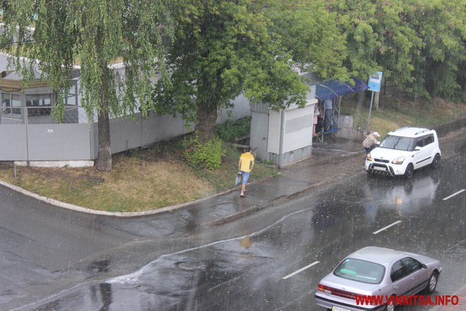 У Вінниці дощить. 1 липня близько 14:30 вінничан застала несподівана злива, яку за день до цього не прогнозували синоптики. Підсилює непогоду сильний вітер. Дороги буквально заливає водою. По-літньому вдягнуті городяни, прийнявши «душ», вже й не поспішають тікати по домівках.