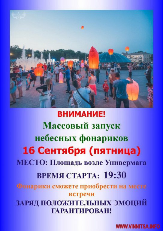 16 вересня у Вінниці на площі біля Універмагу масово запускатимуть небесні ліхтарики.
