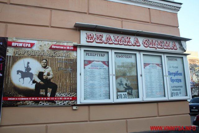 27 березня у Вінниці міжнародний день театру відсвяткували прем’єрою режисера-постановника Тараса Мазура «Народний Малахій». О 18.30 у залі Обласного музично-драматичного театру імені Садовського немає вільних місць. Зібралися театрали та перші особи Вінниччини та міста.
