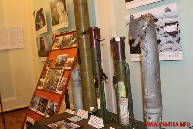 Для повної зали Захисників влаштували концерт. А в холі облаштували фото виставку та експозицію зброї, уламків.