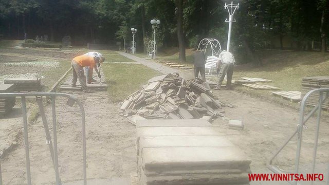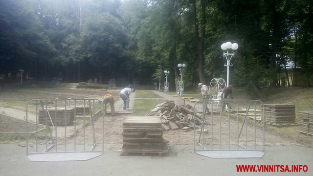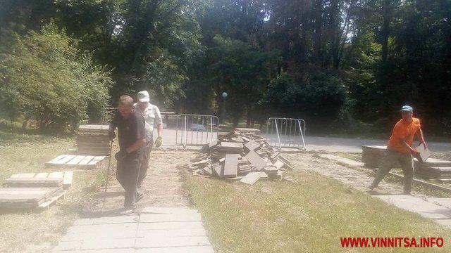 18 липня у Центральному парку Вінниці біля кіноконцертного залу «Райдуга» демонтують тротуар на «Алеї закоханих». Ремонтники зривають тротуарну плитку.